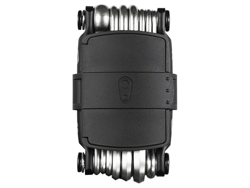 Multiværktøj fra Crankbrothers med 20 forskellige stykker værktøj, inklusiv et integreret dæk plug værktøj, samt opbevaring til plugs og ekstra kædelink.