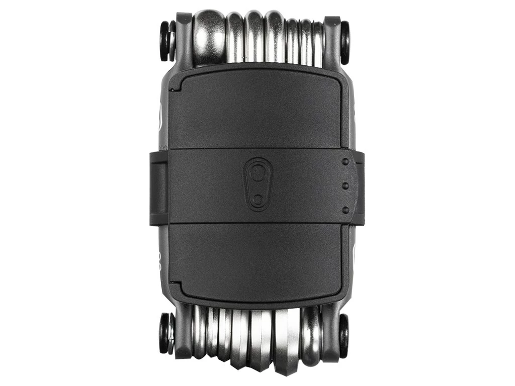 Multiværktøj fra Crankbrothers med 20 forskellige stykker værktøj, inklusiv et integreret dæk plug værktøj, samt opbevaring til plugs og ekstra kædelink.