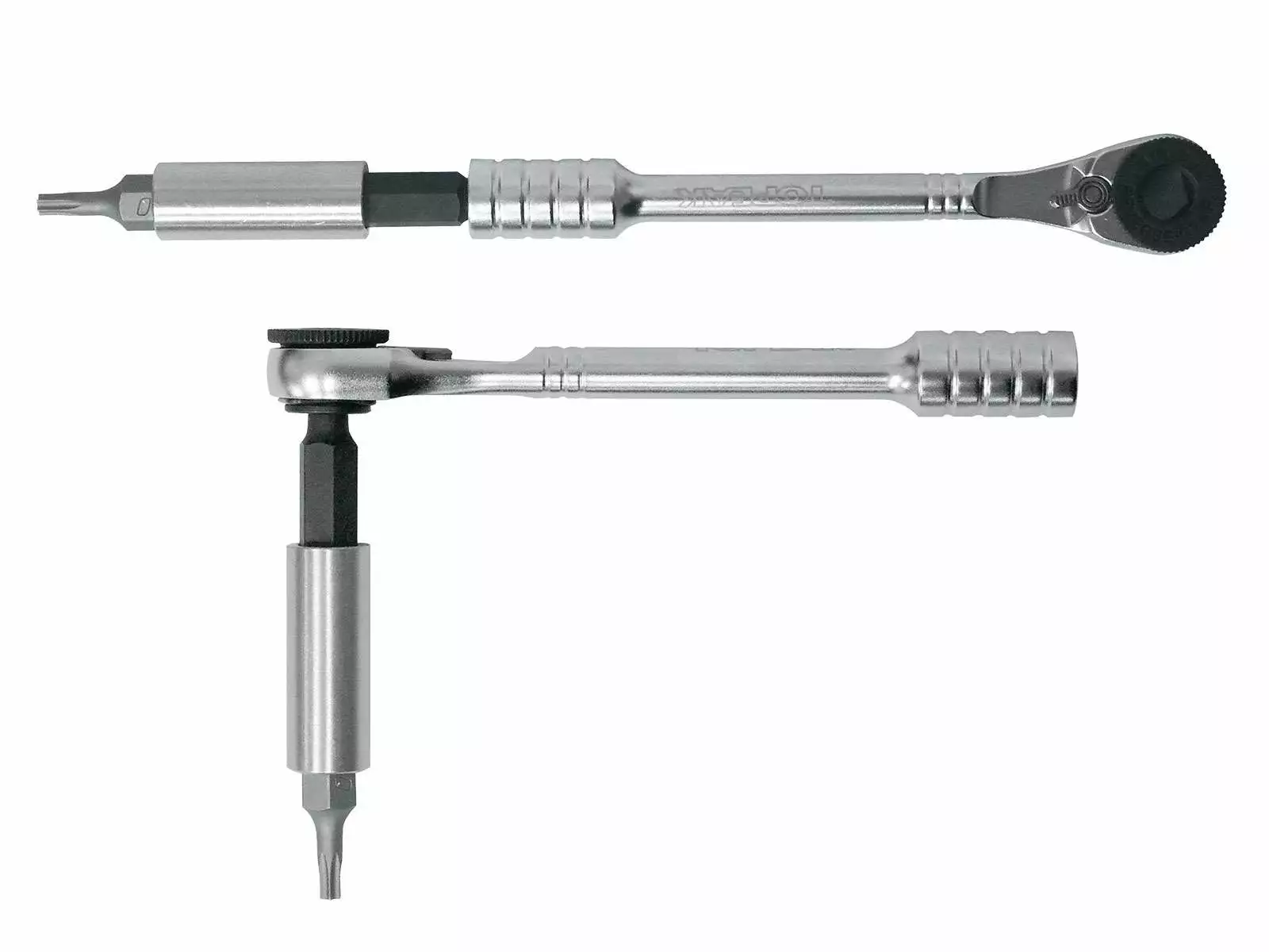 Bits kan monteres i begge ender, så du kan vælge at bruge nøglen som skruetrækker, eller almindelig skraldenøgle.
