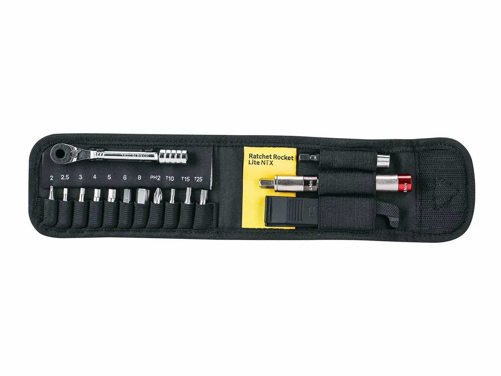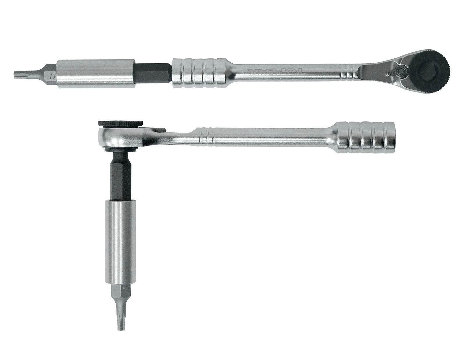 På topnøglen kan de medfølgende momentnøgleenheder monteres. De er forudindstillet til 4, 5 og 6 Nm, hvilket passer til de fleste delikate dele, f.eks. carbon og fin gevind.